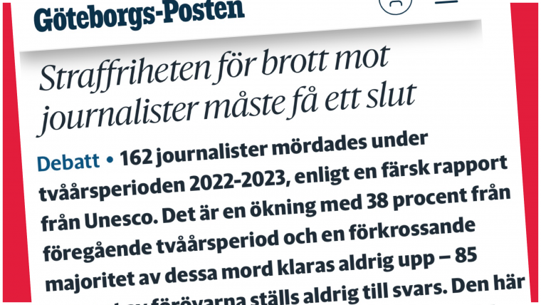 Den 2/11 är det Internationella dagen mot straffrihet för brott mot journalister och det är hög tid att öka takten i arbetet mot hot och hat liksom dödligt våld mot de yrkesmänniskor som håller oss andra informerade om vad som sker i världen.